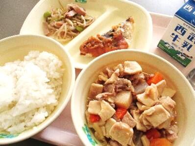 ごはん サバのみそだれかけ 高野豆腐のうま煮 もやしとハムのピリ辛炒め 牛乳