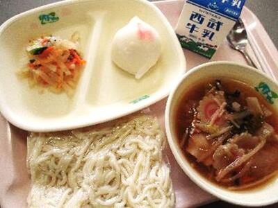 広東めん(中華めん) 桃まんじゅう 大根のごま酢和え 牛乳