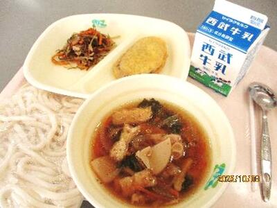 鶏南蛮うどん(地粉うどん) さつまいものてんぷら こんぶの炒め煮 牛乳