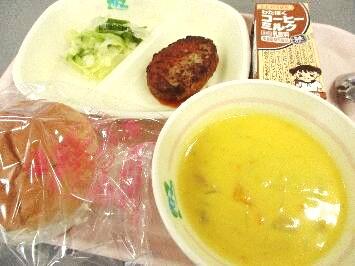 子どもパンスライス ハンバーグのシャリアピンソース グリーンサラダ パンプキンシチュー コーヒーミルク