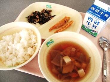 ごはん きびなごのカリカリフライ ひじきと大豆の炒め煮 けんちん汁 みかん 牛乳