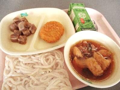 きつねうどん(地粉うどん) かぼちゃコロッケ ゆずみそ田楽 お茶