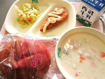 こどもパンスライス ホッケフライ タルタルソース(フィッシュバーガー) ホワイトシチュー フレンチサラダ 牛乳