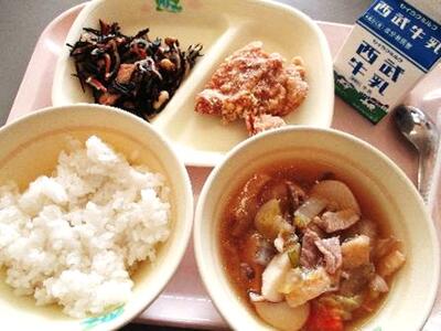 ごはん 鶏肉の唐揚げ ひじきと大豆の炒め煮 いものこ汁 牛乳