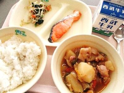 ごはん サケの塩焼き 根菜と鶏肉のピリ辛煮(有機じゃがいも使用) ほうれん草のお浸し 牛乳