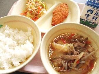 ごはん ホッケフライ ソース ごま和え せんべい汁 牛乳
