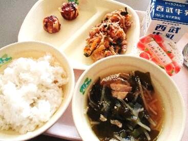 ごはん ポーク焼売 豚キムチ わかめスープ 桃ゼリー 牛乳