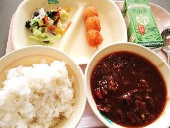 ハヤシライス(ごはん) うずら卵の串フライ 海藻サラダ お茶