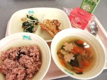 赤飯 鶏肉の唐揚げ みそ和え お祝いすまし汁 お祝いケーキ☆ お茶