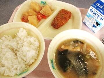 ごはん アジフライ ジャガイモのそぼろ煮 大根の味噌汁 牛乳