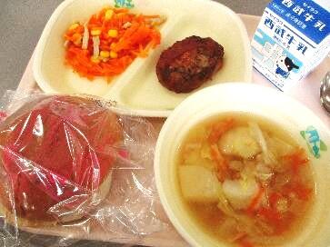 子どもパンスライス ハンバーグのケチャップソース キャロットサラダ 野菜スープ 牛乳