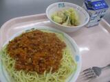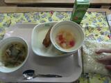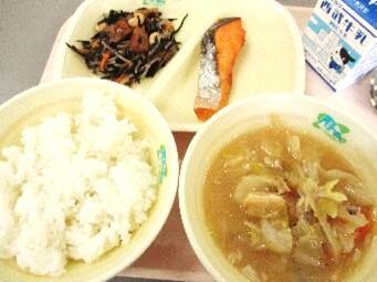 ごはん サケの塩焼き ひじきと大豆の炒め煮 春キャベツの豚汁 牛乳