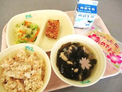 4月27日(月)の給食 投稿: 北野小学校 (19:57) カテゴリー: 今日の給食 K たけのこごはん イカのサラサ揚げ キャベツのさっぱり和え 桜かまぼこのすまし汁 いちごクレープ 牛乳 「更紗(サラサ)」とは、インドで生まれた染め物のことです。木綿の布に様々な色で模様をつけたものです。更紗揚げは、衣にカレー粉の黄やしょうゆの赤が加わるところが更紗に似ていることから名づけられました。(おおぐろの森小学校) -